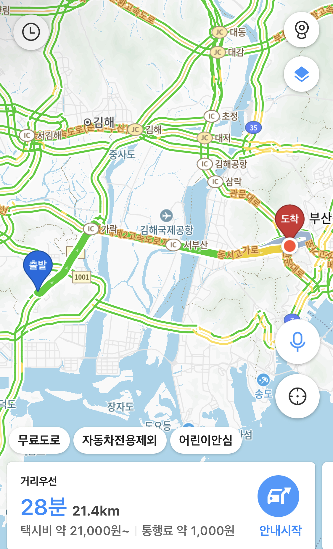 정대리는 출근거리는 20.6km이다. 부산에서 출퇴근 헬 중 하나로 가락IC를 통과한다. 서부산 낙동강교로 올릴 때 사람 미친다.