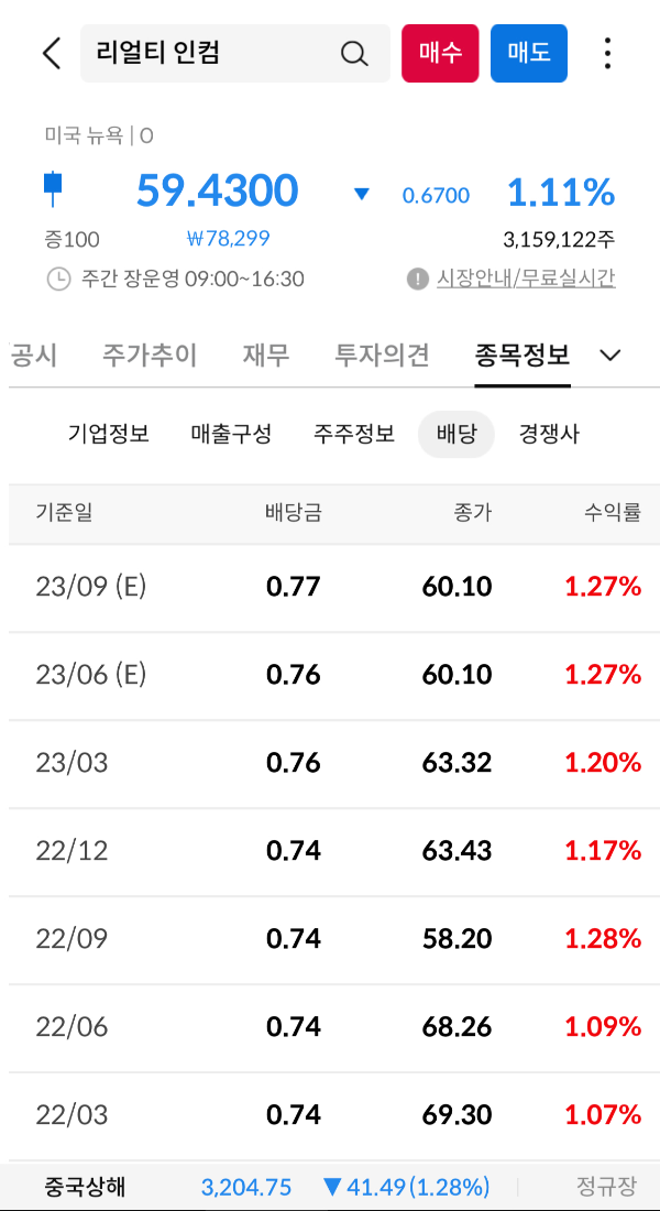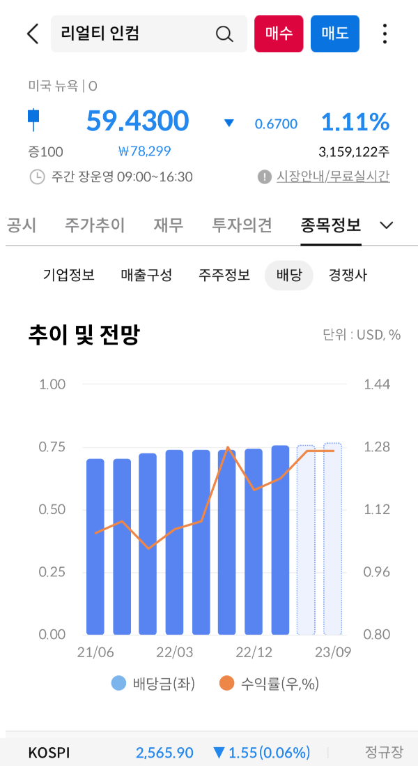리얼티인컴은 월간 배당을 지급하는 주식으로 유명하며, 자산에 대한 수익을 안정적으로 올리고 있기 때문에 그 충실성 및 지속성을 보장하고 있다. 현재 유지되고 있는 배당금은 1주당 약 0.25달러이고 삼성증권 앱에서는 분기별로 나와있지만 매달 지급한다(매달 15일 입금). 배당수익률은 약 4.97%입니다.