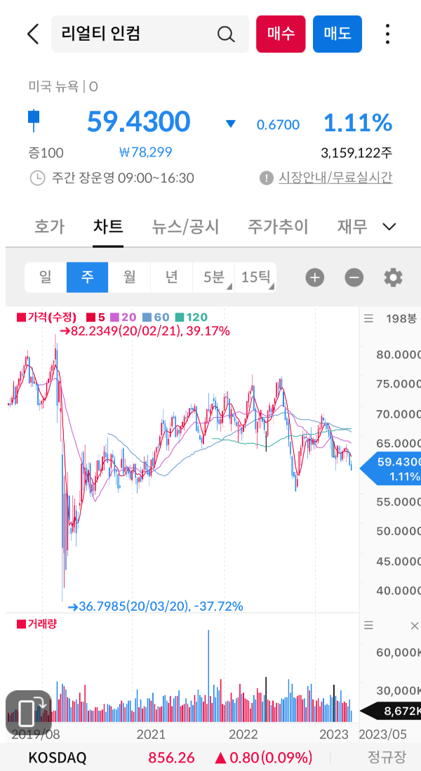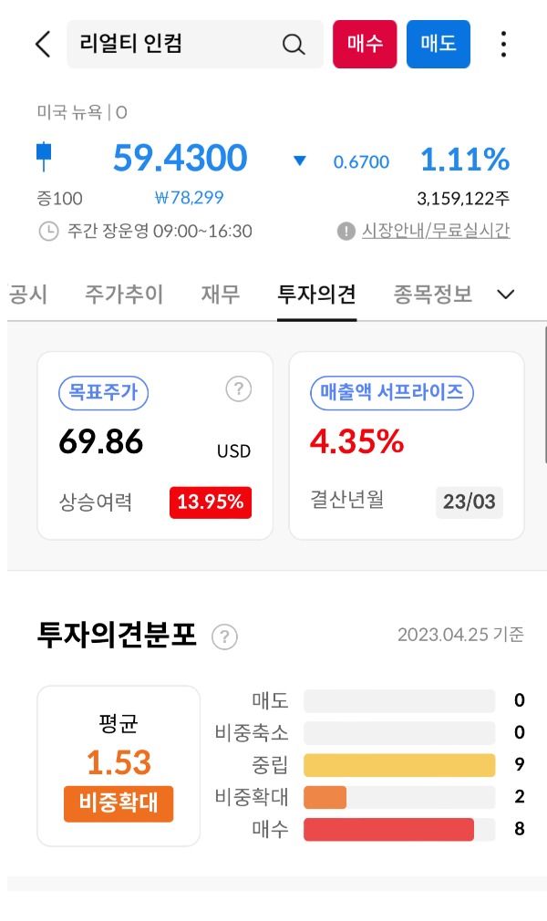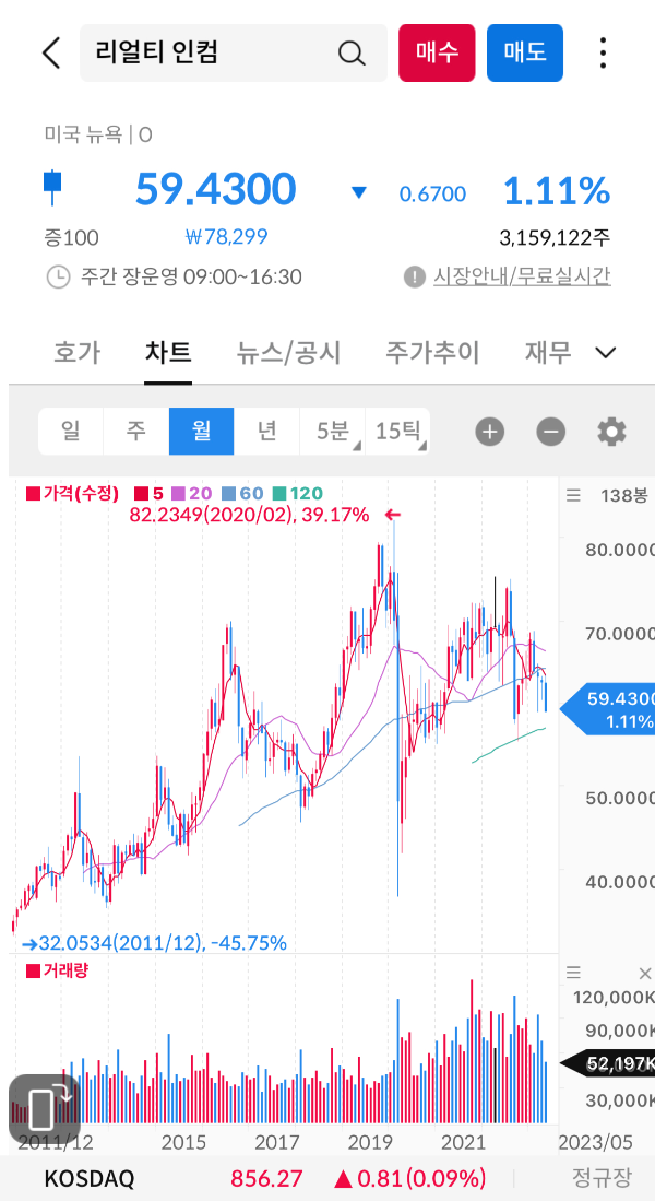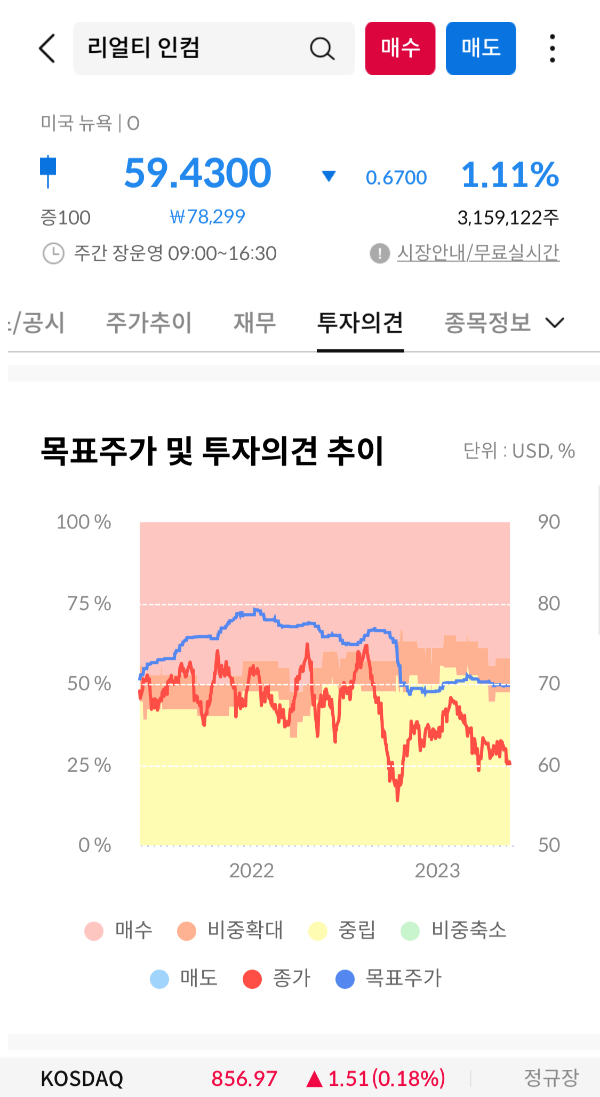 리얼티인컴은 안정적인 수입원과 장기간의 배당금 지급 능력을 가지고 있음으로써 투자자들에게 매력적인 기회를 제공하고 있다. 목표주가는 22년에 80달러까지 갔으나 경제상황 등을 고려해서 목표주가를 낮추고 있음에도 현재 종가가 상승하지 못하고 있다. 그럼에 전문 투자회사의 의견이 현 종가보다 상승 여력이 13.95% 정도이고 포트폴리오에서 배중을 확대해야 된다는 의견과 중립 그러니까 관망을 택하는 비중이 거의 비슷하다. 하지만 매도에 관한 신호는 없으므로 여기까지만 본다면 아직 결정을 내릴 수 없다. 자 그럼 차트를 분석해 보자
