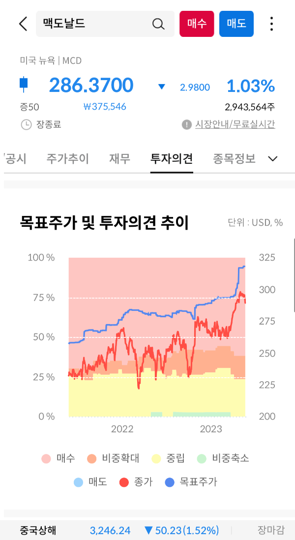 친주주, 배당상승으로 투자자에게 매력적이다. 맥도날드의 브랜드의 가치가 크게 훼손되는 사건이 발생하지 않는 이상 안정적으로 주가가 상승해서 주식투자수익을 올리며 부가적으로 배당수익까지 올려서 포트폴리오를 잘 작성 시 매달 월급 받는 기분으로 배당금을 안정적으로 받을 수 있으므로 괜찮아 보인다.