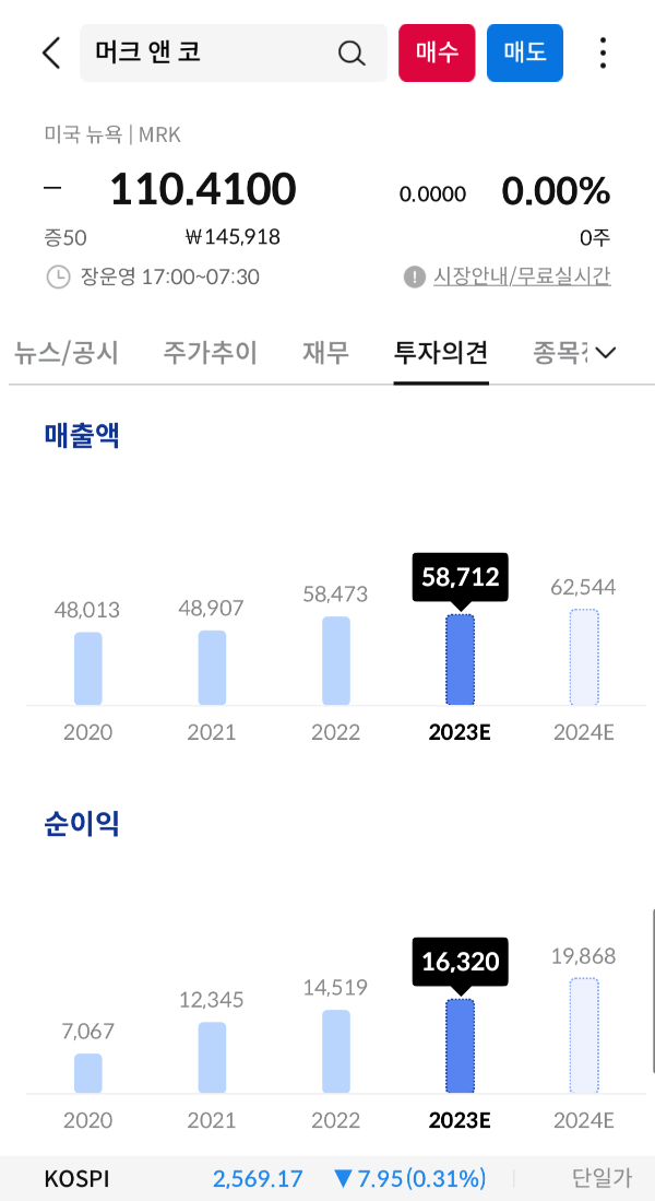 머크의 매출액이 소폭상승하고 있고, 그에 따른 영업이익률, 당기순이익, 영업이익률 모두 상승하고 있다. 그리고 매출액은 정말 소폭 오를 것으로 예상되는데 순이익이 많이 올랐다. 머크사의 영업팀이 물건을 잘 팔고 있나 보다. 이러한 기대심리의 효과인지 모르겠지만 다음 연도 매출액의 상승과, 순이익의 상승을 예상하고 있다.