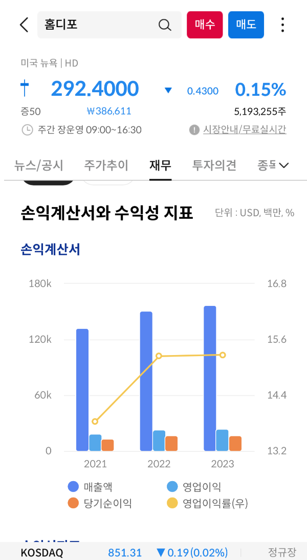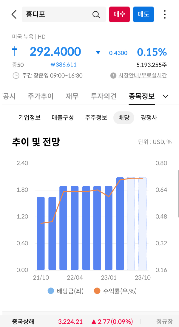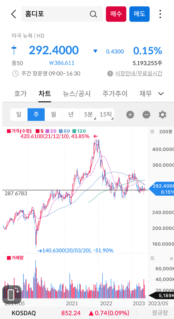 지금 홈디포의 목표주가는 23.05.31(수) 기준으로는 313.6달러이므로 상승 할 여력 14.13%이다. 아직 상승할 여력이 많다는거다. 나는 차트를 볼 때는 관망이였지만 한주씩 구매할꺼 같다. 물론 이것을 작성할때 쓴 삼성증권을 이용하거나, 토스뱅크의 소수점 매매로 구입을 할 예정이다. 한주당 너무 비싸다. 지금 안그래도 돈없는데 슬프다.