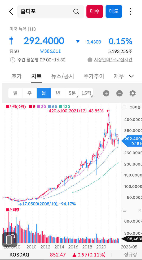 홈디포는 지속적인 성장과 안정적인 배당금 지급으로 투자자들에게 호감을 얻고 있는 기업이다. 지금 주봉과 월봉의 차트를 보면 바닥을 다지며 횡보하면서 가격을 조정하는거같다. 그렇다면 나는 매수를 할 예정이다. 지금은 말고 급여가 들어오는 날에 말이다.