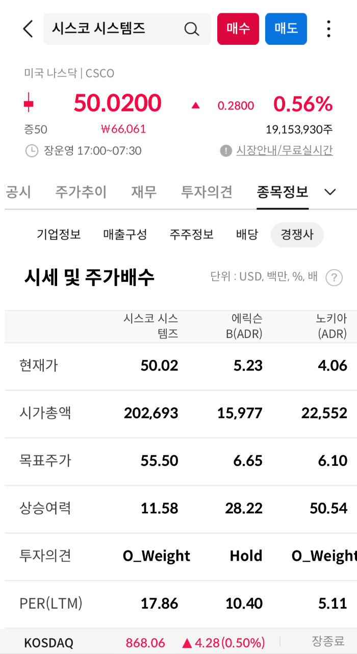 시스코 시스템즈의 주가는 일관적인 성장과 안정적인 수익률로 투자자들에게 인기가 있다. 회사의 성장률은 주요 경쟁사들에 비해 견조하게 유지되고 있으며, 영업이익률도 상위군의 수준에 위치해 있다. 이러한 금융 성과 지표는 기업의 경쟁력 및 시장 점유율을 확인하는데 중요한 요소가 된다.