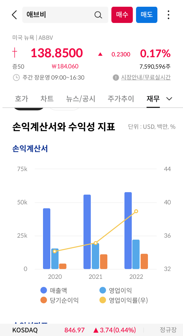 애브비(ABBV)의 재무제표 분석을 통해 매출액, 순이익, 손익계산서를 확인할 수 있다. 매출액은 소폭 상승과 소폭하락을 반복하며 서서히 매출액이 상승하는 거 같다. 하지만 순이익 같은 경우는 2020년대에서 2021년 사이에 큰 폭으로 상승했다. 펜데믹 사태에 힘을 입었는지는 모르겠다. 지금 2023년은 순이익금이 높으므로 재무건전성은 좋은 거 같다. 대부분 제약회사가 재무건성정이 안 좋은데 미국이라서 그런가 괜찮다. 매출액, 당기순이익, 영업이익이 꾸준한 상승을 보이고 있으므로 투자하기는 나쁘지 않은 것으로 보인다.