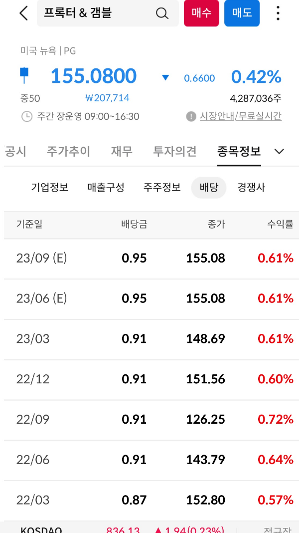 - 배당투자에 대해서 알아본 사람이라면 P&G를 모른 사람이 없을 것이다. 그만큼 배당이 안정적인 회사이다. 그리고 알아보면서 이렇게 많은 제품군을 만드는 회사인 줄 몰랐다. 현재 쓰고 있는 물품 중에 P&G회사의 물건이 많은 줄 몰랐다. 한주를 사더라도 부담이 되는 주가이므로 소수점 매수로 해야겠다.