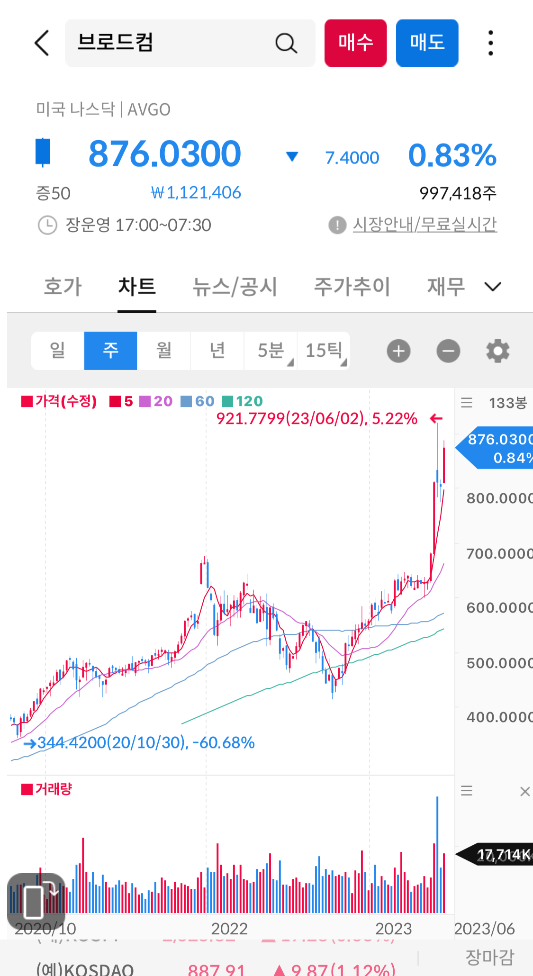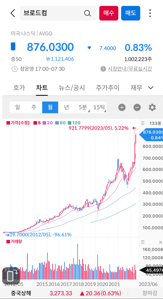 브로드컴의 주가는 주봉이든 월봉이든 딱히 볼게 없이 우상향으로 전형적인 상승세를 그리고 있다. 다만,