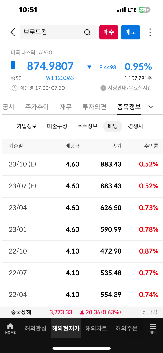 브로드컴은 지속적으로 안정적인 이익을 창출하기 때문에 높은 배당성향과 안정적인 배당금을 지급하고 있다. 이를 통해 투자자들에게 경제적 이익을 제공하고 있으며, 연간 배당금 증가와 높은 배당수익률로 인해 호감을 받고 있다. 배당은 1월, 4월 ,7월, 10월에 배당금을 지급하고 있으며, 배당수익률은 1.97%이다