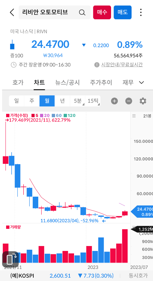 주봉 : 상장한 첫날부터 음봉을 기록하면 계속 꼴아 박고 있는 상황이다. 하지만 2023년 07/07일을 기준으로 상승을 이어 갈꺼같다. 60일 이동평균선을 타고 있는 상황이다. 정대리 개인적으로는 27달러 정도까지 올라갔다가 한동안 그 가격을 유지할거 같다.