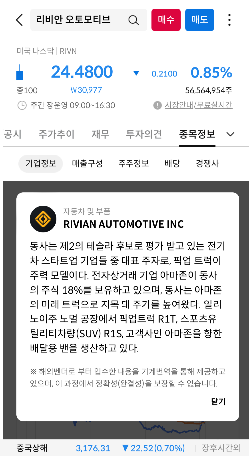 리비안은 2009년 설립된 미국의 전기차 제조업체로서 전기 픽업트럭 R1T와 전기 SUV R1S를 개발하고 있으며, Amazon과 Ford와 같은 주요 투자기관들로부터 자금을 유치한 바 있다. 친환경적인 이동수단 개발을 적극적으로 추진하며, 전기차 시장에서 주목받고 있다.