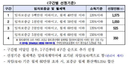 2. 선정 방법: 임차보증금 · 월세 및 소득 기준에 따라 4개 구간으로 나누어서 선정한다. 그러나 선정 인원 초과 시, 구간별로 전산추첨을 한다고 한다.