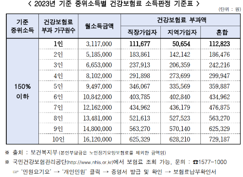 ※23년 기준 중위소득별 건강보험료 소득판정 기준표