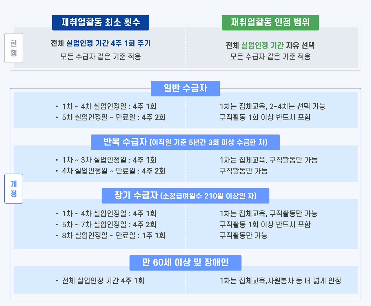 - 면접 : 고용센터에서 면접을 통해 구직 의사를 확인받아야 한다.