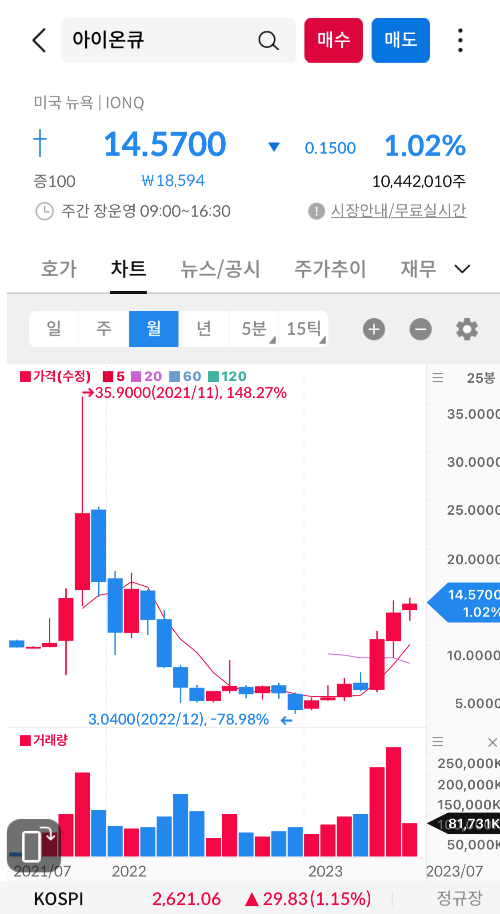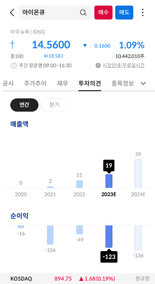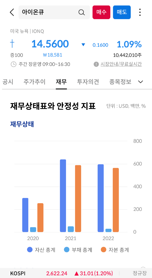 아이온큐는 2020년 10월, 미국 주식시장에서 SPAC(특수 목적 충족 회사)인 SAIC를 통해 나스닥상장을 했다. 이후로 매출액이 점점 상승하는 만큼 순이익이 빠져나가고 있다. 아무래도 제품을 개발하려니 돈이 많이 들어가는거 같다. 아직까지는 투자자를 모아서 제품을 개발하고 하는거 같은데, 양자컴퓨터가 실용화가 된다면 엄청나게 주가가 오를거 같다.