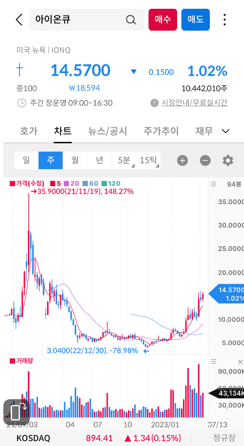 아이온큐가 미래 성장 가능성이 높은 양자컴퓨팅 산업에서 선점 차원에서 지속적인 발전을 이룰 것으로 예상하고 있다. 하지만 주가는 끝도 한도 없이 내려가서 투자자들이 정말 많이 힘들었을 것이다. 하지만 이번년도부터 다시 상승세를 이어갈 것이라고 생각한다