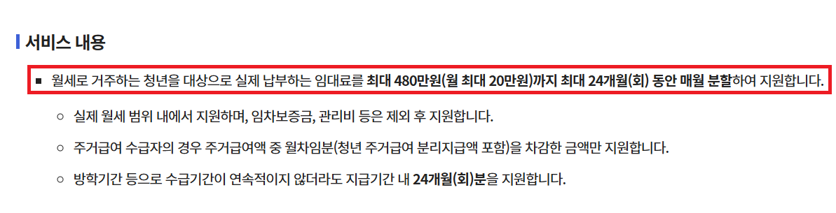 - 실제 납부 월세를 기준으로 월 최대 20만 원씩 총 24개월(480만 원)까지 지원합니다.