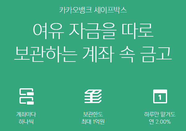 카카오뱅크의 세이프 박스의 이자율은 연 2%이다. 단 하루만 맡겨도 이자를 받을 수 있다. 그리고 이자지급일은 매월 네번째 금요일의 다음날 또는 고객이 이자지급을 요청한 날에 바로 받을 수 있다.