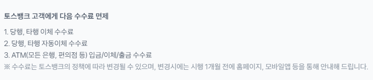 토스뱅크 같은 경우 월급이 들어오고 비상금을 토스뱅크에 이체만 하면 끝이라서 좀더 편한다. 그리고 비상시 현금이 필요한 경우 바로 카드 들고 출금을 진행해도 수수료도 없고 말이다.