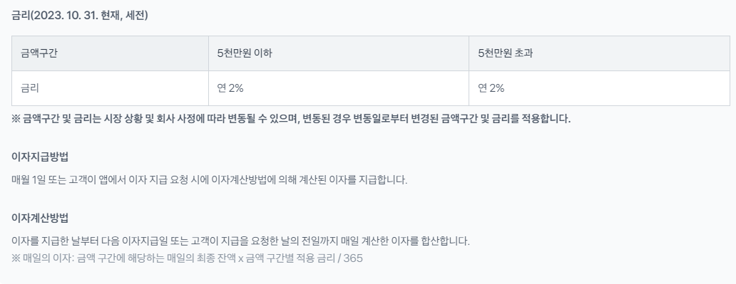 머... 5천만원 이상 넣으실 분이 있을까는 모르겠지만 5천만원 이하든, 5천만원 이상이든 동일하게 연 2%씩 이자를 주는 고마운 상품이다. 아마 매일 이자를 받으면서 원금에 넣으면 복리 혜택을 누릴 수 있지 않을까? 아님 말고.
