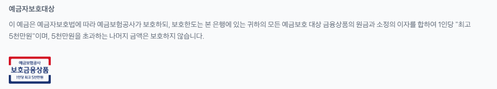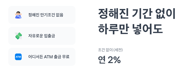 카카오뱅크와 마찬가지로 만기조건은 없고, 연 이자율도 동일하게 2%이다. 보통예금형으로 분류되므로 이것 또한 5,000만원 까지 예금자보호가 되기에 큰 걱정을 안해도 된다.